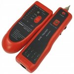 Przenośny tester okablowania. Tester posiada dwa rodzaje gniazd, do testowania złącz: RJ45, RJ12, RJ11.